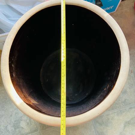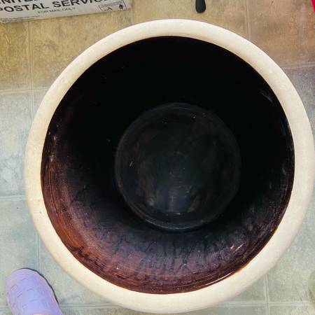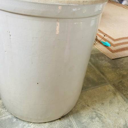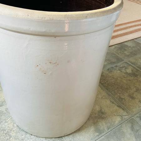 • Vintage 10-gallon glazed stoneware crock with dark brown interior and cream exterior