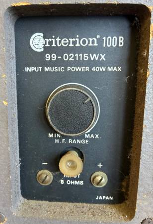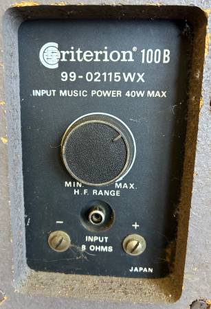 Two Criterion 100B speakers in nice wooden cabinets 22” x 12” x 10”. Each speaker incudes a 10” woofer, 3” midrange, 1.5” tweeter, and a bass port. High Frequency Range adjustment control. Never...