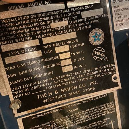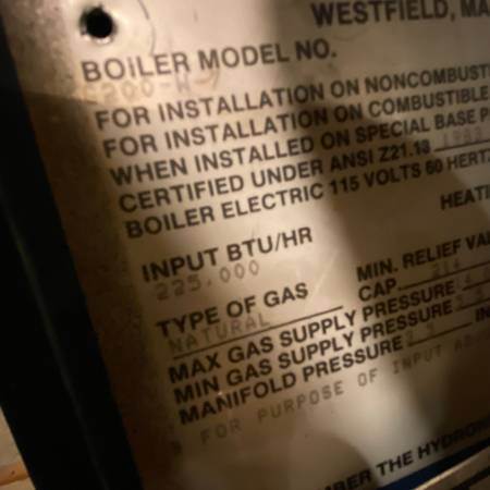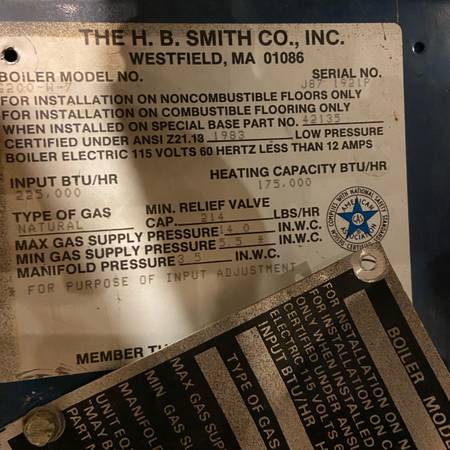 boiler model G200-W-7 serial #J87 1921P heating Capacity 175,000 Natural Gas Input BTU/Hr 225,000 Selling a H.B. Smith G200-W-7 gas-fired hot water boiler. Fuel: Natural Gas Input: 225,000 BTU/hr...