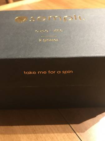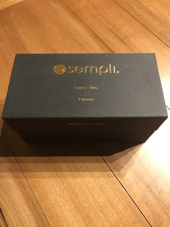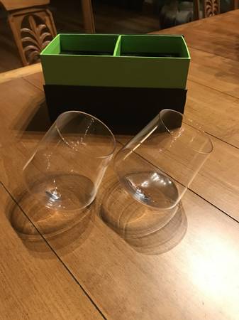 Pair of Cupa-Vino wine glasses from Sempli. These stemless lead free crystal glasses help oxygenate your wine when you set it down since it causes the wine to swirl. Each glass is 4 inches tall and 3.75 inches wide. They are new, never used, in the original box.