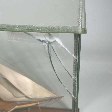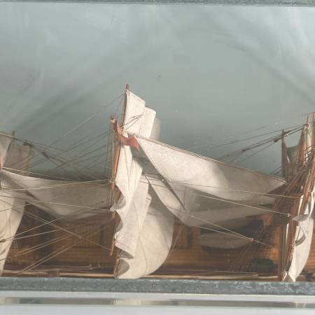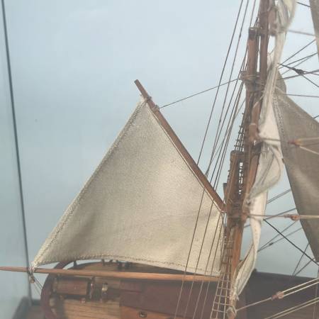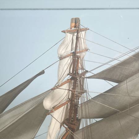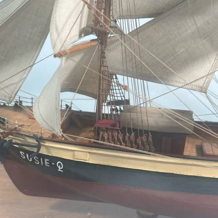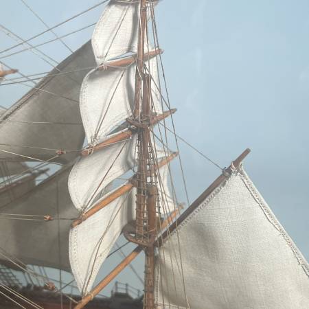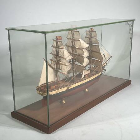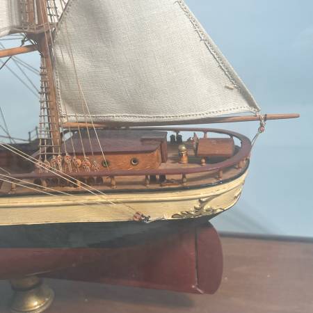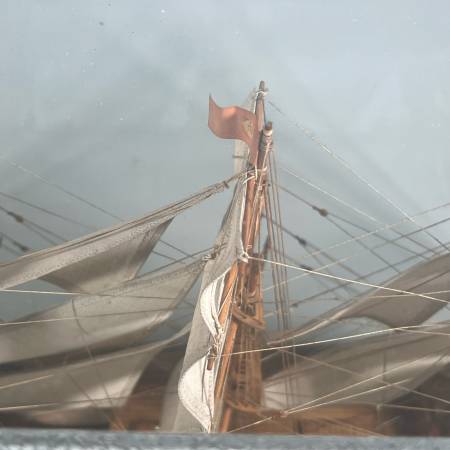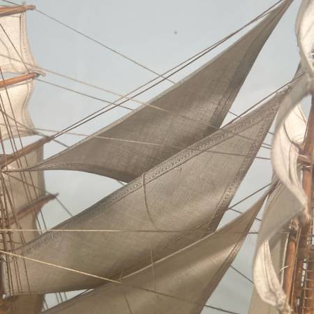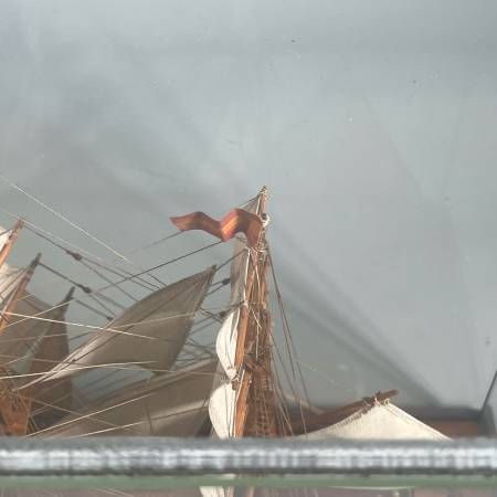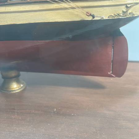 Clipper ship is painted dark red, black and off white. Has delicate "ropes", sails and chains. - h. 14 x l. 25.5 x d. 8.5 in.