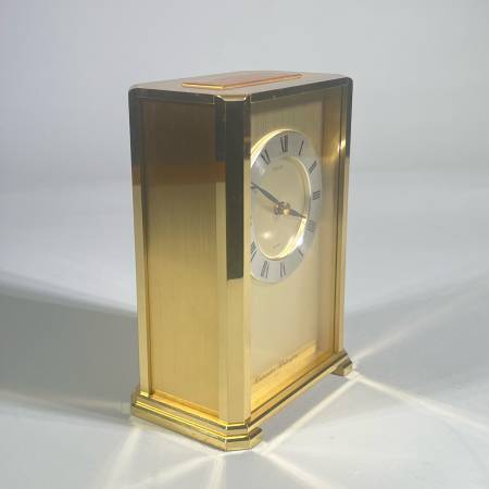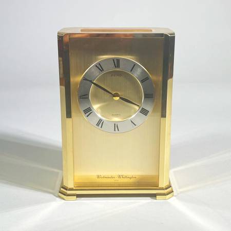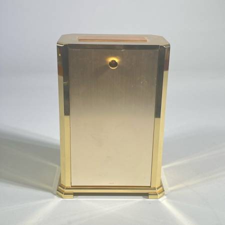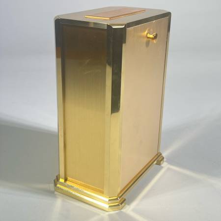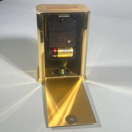 With Westminster-Whittington chimes. Battery run. Engraved on top for an “appreciation” gift. Rear access panel shows quartz movement, chime selector, volume control, and battery compartment.