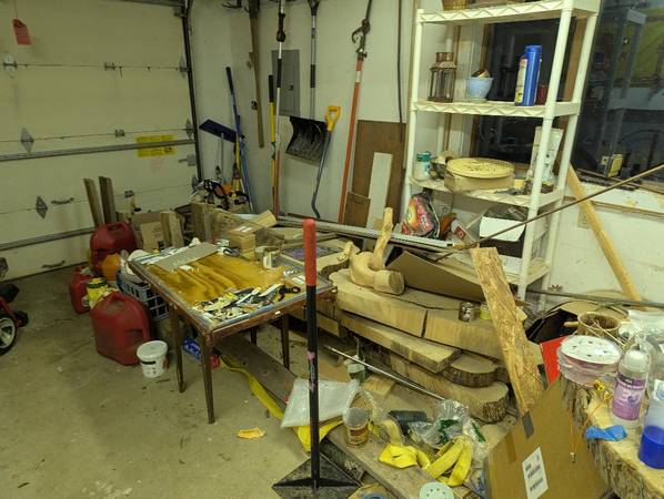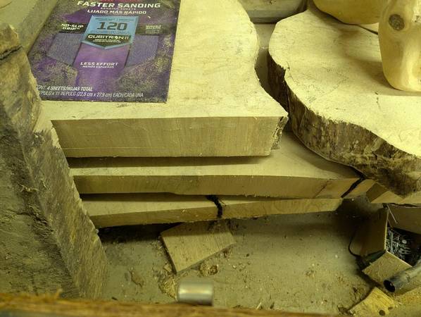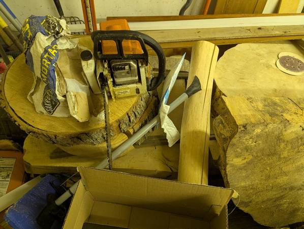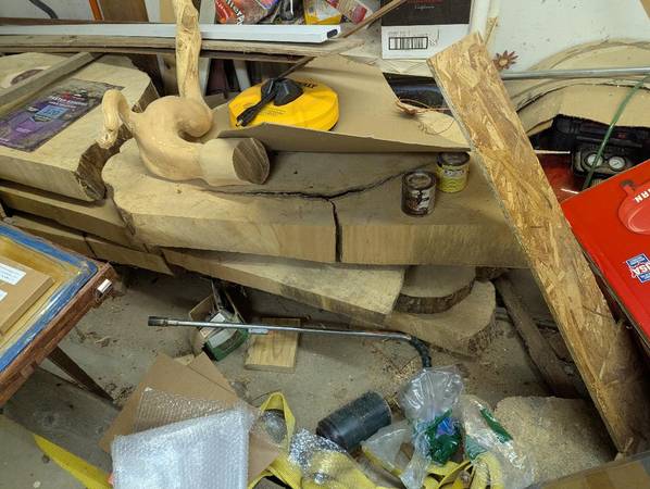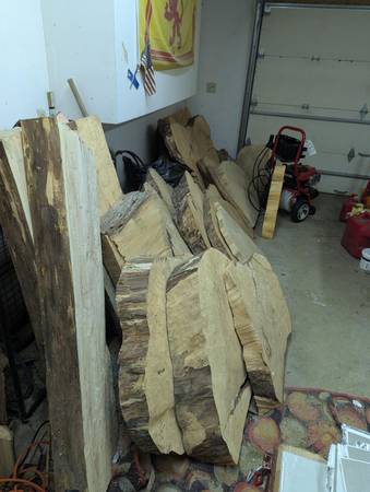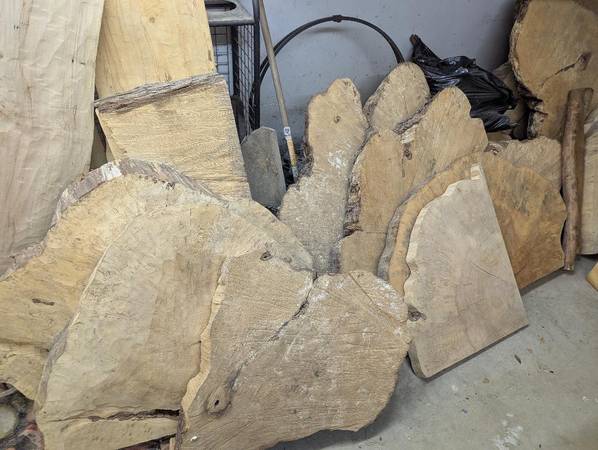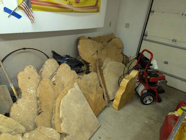 Approximately 22 sanded slabs on the right of the garage in the photos, most of which are the same cut so they are similar. A little warping has occurred in storage but would be light work for a belt sander to get flattened perfectly again. The bottoms are not flattened. The Wood on the left of the garage is unworked, and approximately 20 more pieces of different shapes and sizes, all useable for furniture. In the corner is a very large slab. It is all maple. Most of the slabs have a thick edge of approximately 4 inches. The wood on the right has had the edges worked and smoothed down as well, still leaving the character and shape of the wood as well as the "live" edge, it is just not sandblasted quality. They make very nice tables I have made a few with them which I can send photos of if desired. This is pickup only. Please inquire about exact pricing the $3000 is just ballpark.