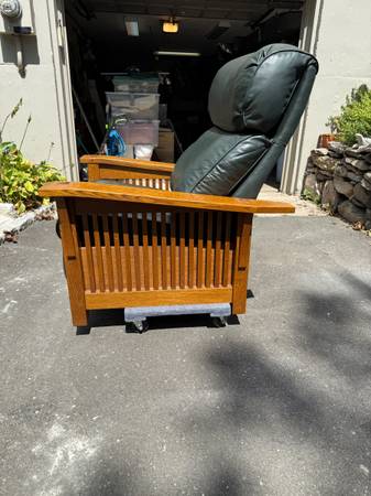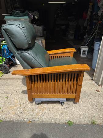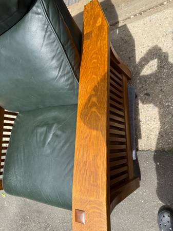 This Spindle Morris Chair was the forerunner of the modern recliner and is part of the 1989 reissued Mission Collection. This Recliner features beautiful oak softly canted arms supported by corbels, exposed through-tenons, and rows of spindles that recall Gustav Stickley's original design. A bustle back ensures comfort and makes this a best-in-class recliner. The Leather is dark green and has some pet marks.