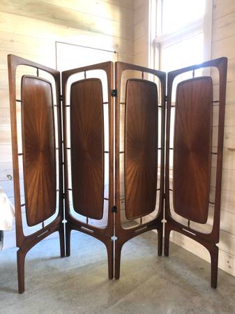 Midcentury mirror teak 2 sided folding screen. Excellent condition. 4 panels @ 24” wide panels, 68” high. To store the dimensions are 6” deep x 68” high stacked together. Very special, very rare. Excellent craftsmanship.