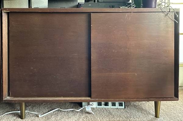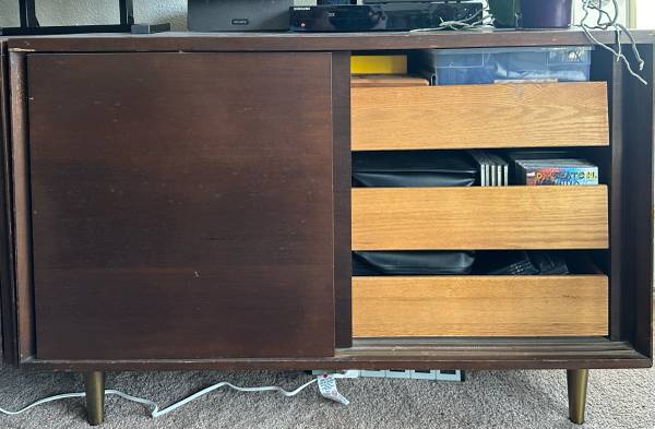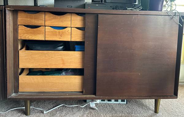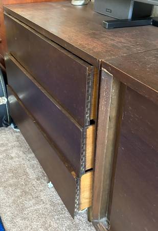 Perfect for bedroom, art studio, dining room, living room, office, college dorm. Use as is or refinish to stain or lacquer/paint. The cabinets could use some work but I built that into price plus some. Or use as is, very nice cabinets. The wear is more obvious in the photos because I cleaned the tops thoroughly after removing them from my mother’s home and thus some of the stain was removed. I opted not to refinish or restrain, leaving that to new owners. See lots of photos, and last image pointing out chips so you can see they are very minor (compare to my finger). Stain, refinish, or sand and lacquer and gave fun. Or use the cabinets as is. Incredible storage. Solid strong pieces. Genuine midcentury. Manufacture labels attached.