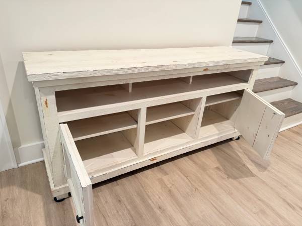 New condition except for the chip in the pictures part of the footer. That part has been reinforced with steel elbows - it’s solid. Stand is solid wood. It’s 64” wide by about 17” deep by 30” high.