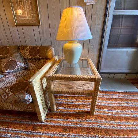 β’ Set includes 2 rattan end tables and 2 matching ceramic lamps with shades