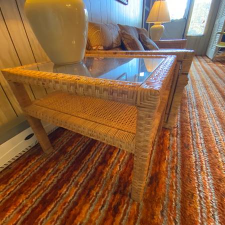 β’ Tables feature woven cane lower shelves and sturdy rattan frames