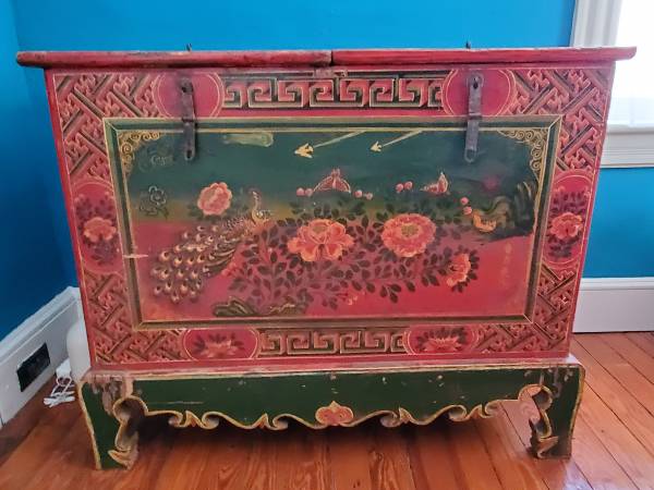 Vintage Asian Wood Storage Trunk With Ornate Red Painted Reliefs. Very unique piece that can be used for decreative purposes and/or utility storage unit. 2 top slide out doors opens up to 1 large trunk space which is lined with red velvet flower patterns. Original hardware.