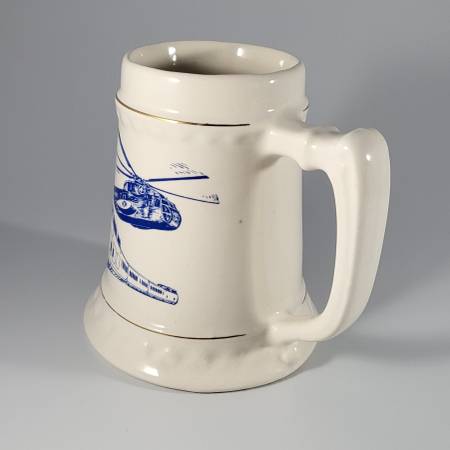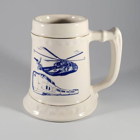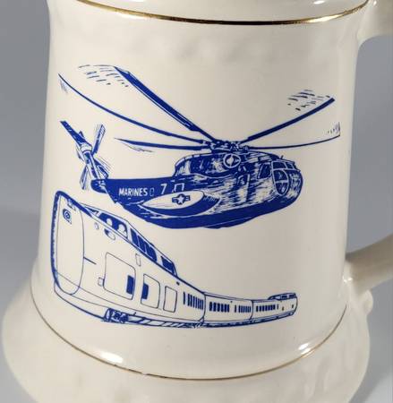 Rare 1968 United Aircraft Corporation Sikorsky USMC Marine Corps CH-53 Sea Stallion Helicopter and High Speed Turbo Train cup/mug/stein. Measures 5.25" tall x 4.5" at base. Excellent condition, no wear, cracks or damage.
