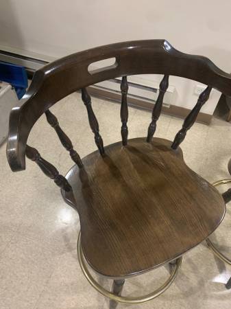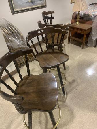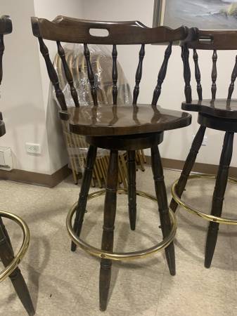 Great condition, wood with brass colored foot rest. These are BAR height (taller then counter Island stools). Seat is 29" high off the ground. Chair has back rest and swivel. All 4 for $300, cash...
