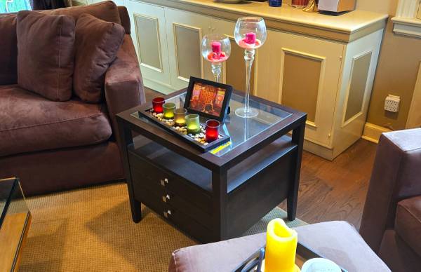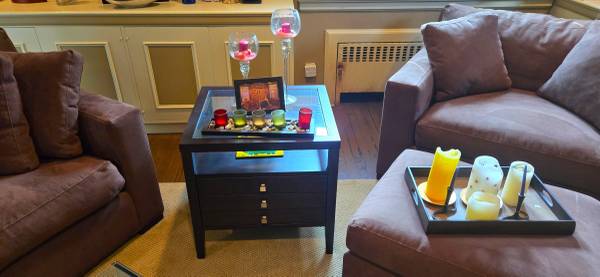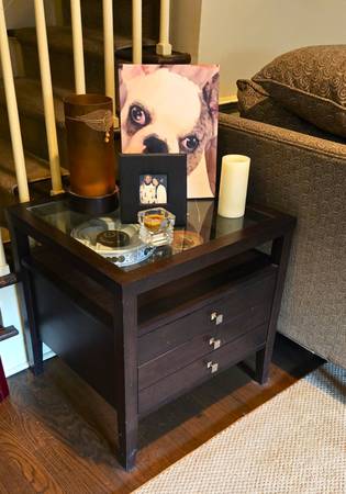 These are 2 matching wood with glass top living room side tables with draws that are in good condition with minor scratches. 24" inches wide by 22" inches deep by 24" inches high. Good condition...