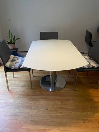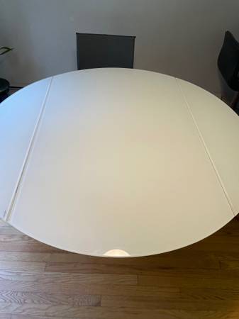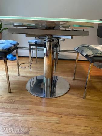 Glass table with a mechanical feature that turns and from the rectangle shape gets into a circle. Can fit 8 people total. In a perfect condition.