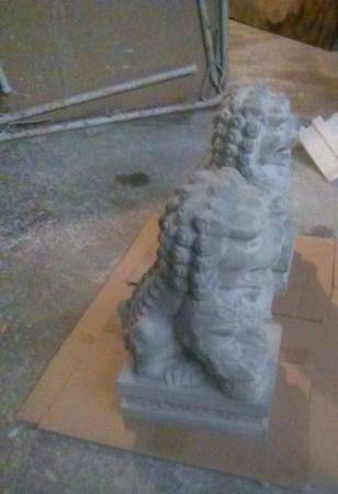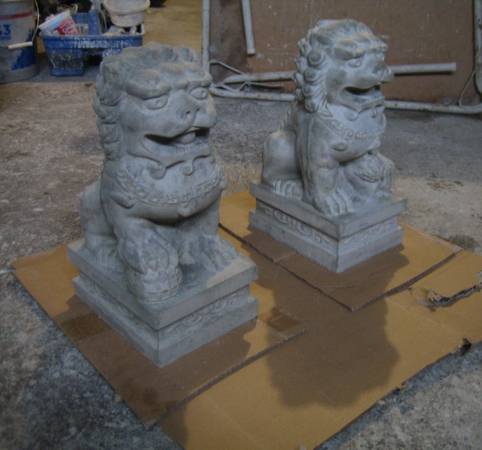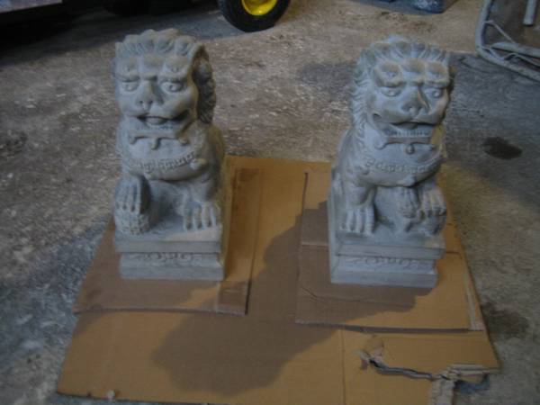 Unique gift for someone special. 10 L x 7"W x 14"H . Base measures 6.5Wx9.5D. Real Chinese designed. Something different to add to your Oriental/Asian themed Garden. I recommend to paint or seal- waterproof to protect and last longer outdoors . 2 SMALL IMPERIAL CHINESE GUARDIAN LIONS FOR ENTERANCE. I DO NOT HAVE A LARGER SIZE. They are each different, a female with a pup and a male with a ball. Some people call them a Foo Dog, or Dogs. They are Chinese lions. Pair of 14 inch tall Chinese Statues for entrance, garden, patio home. Solid Concrete. 4000 psi