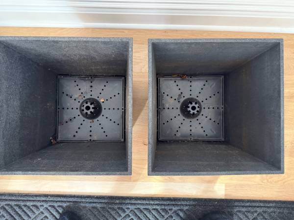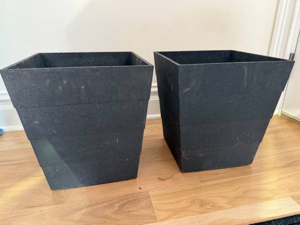 Matching pair of flower planters with optional plastic pots inside, good drainage, in good condition 14"Hx12"Wx12"D $15 for the pair