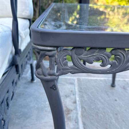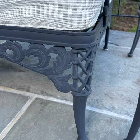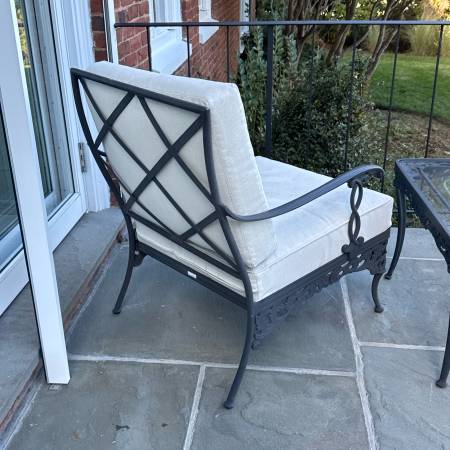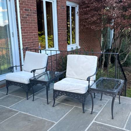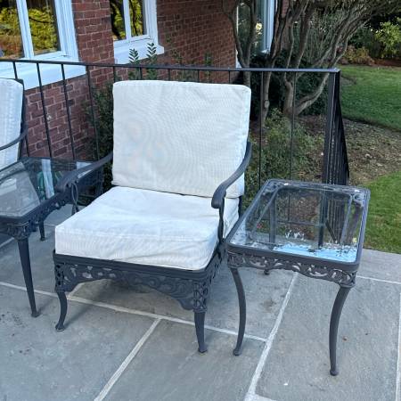 Including two arm chairs and two tables with glass tops. Appears to be made of cast aluminum. - h. 32.75 x w. 26 x d. 29 in. (Arm Chair)