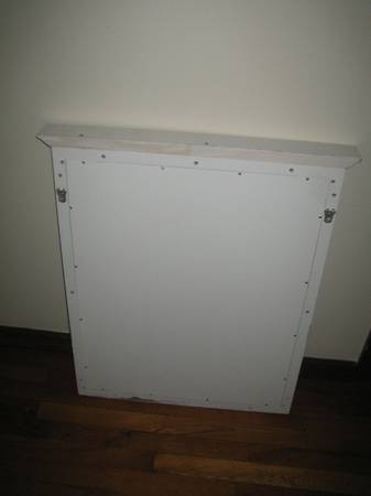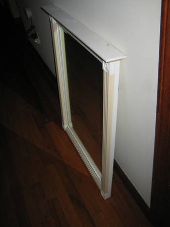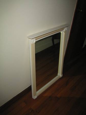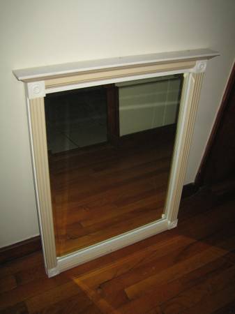 Great for Bathroom or half bath. just hangs on wall. 31 1/4in. H total height. 26 1/4in.wide with top total. Good for 1/2 bath or full bath. Mirror made of real wood not composite .a Real wood and glass. is 2 feet wide. mirror center is 27H x 20 1/4W. Lightly used but in very good condition. no scratches on mirror at all. off white and white. Back side hangers. Antique style. Can be repainted all white or colored with flowers etc.
