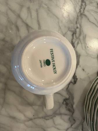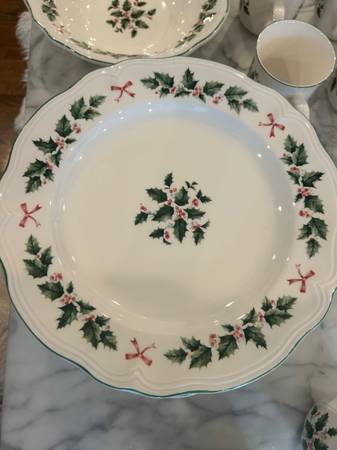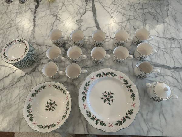 12 Dinner plates, 12 cups, 12 saucers, sugar & creamer and small salad/ pasta bowl.
