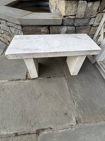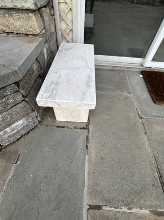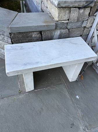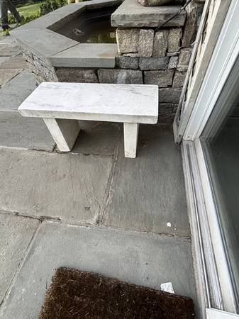 White marble bench, clean lines. Great for outdoors or indoors. Heavy, but it's in three pieces so it's easily transportable. Located in backcountry Greenwich off of Round Hill Road.
