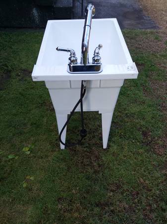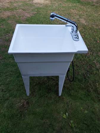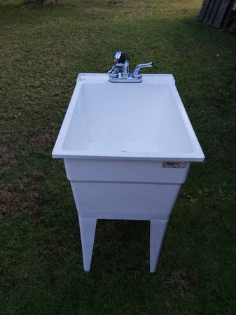 Freestanding utility laundry sink with hot cold and pull out hose. laundry sink, shop sink with faucets and a pull-out hose. 16x20 x 13 deep inside sink 33 in high. 18 by 24 outside dimensions.Adjustable removable legs Monroe CT Good condition.