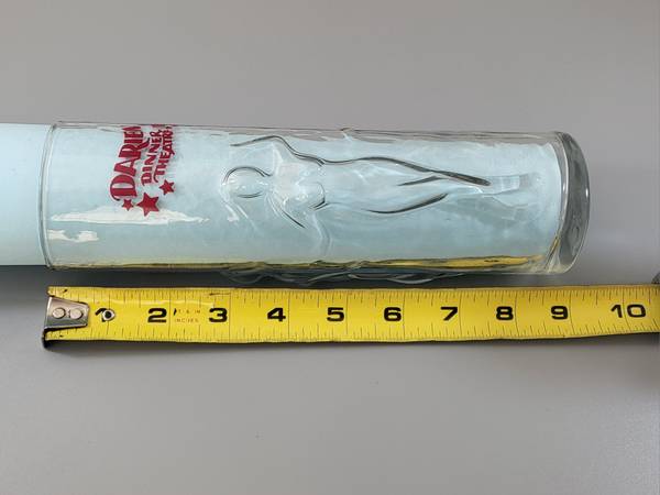 These are (2) 9 inch tall drinking glasses with 4 nude women in raised 3 dimensional glass on the sides. The glass is printed with "Sugar Babies The Burlesque Musical" on one side. The other side has Darien Dinner Theater printed on it. Perfect for your bar, man cave, den, dorm room, or kitchen. Vintage and rare set to find.