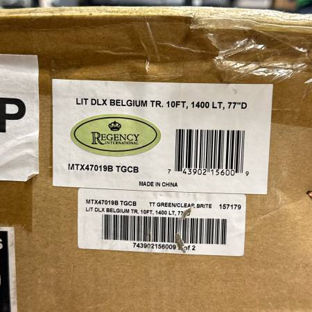 Tree is 10 ft tall with 1,400 ClearBrite lights and 77" diameter. First image is Regency International's most recent version of this tree, so it provides an image of the tree's same look/finish, differing only by height and light count.We did not remove the tree from the box, assemble it, or inventory the pieces - we expect it is complete but we cannot guarantee it. - h. 10 ft