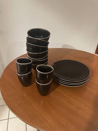 From Terrain Dinnerware including? 5 dinner plates 10 in 4 salad plates 7.5 in 14 bowls. 6 x3.5 4 cups 3.25 x 4.25