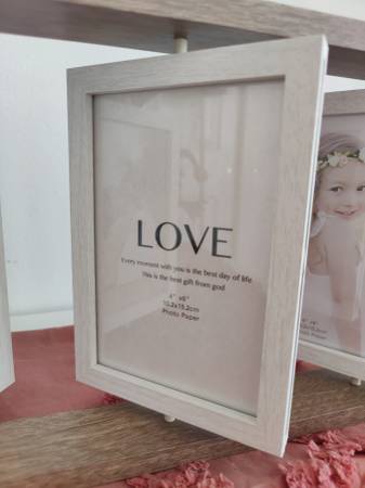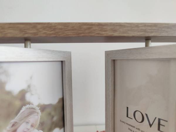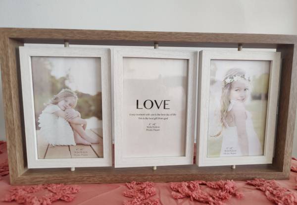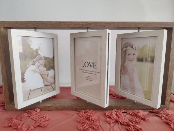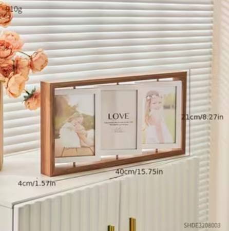 Never used, beautiful 3-panel wooden photo frame. Each frame is double-sided and can rotate. Can display 6 photos at one time. The entire frame is 8.27" high and 15.75" wide. Each panel is 6"x4". Makes a great gift!