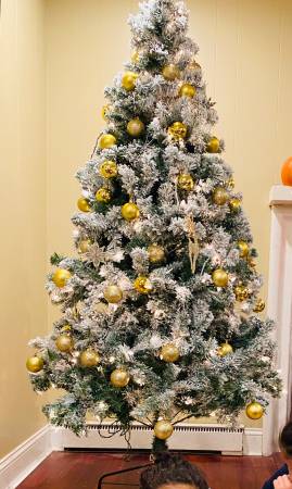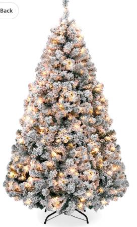 Pre-Lit Artificial Christmas Tree, 6ft Snow Flocked Design Pine Tree, Full Appearance Snowy w/Easy Assembly, Metal Stand. **ornaments not included**
