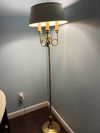 Classic candelabra style brass floor lamp holds 3 bulbs. Metal shade is beige (appears dark when lit). Brass pedestal. 55 1/2" tall, 13" wide