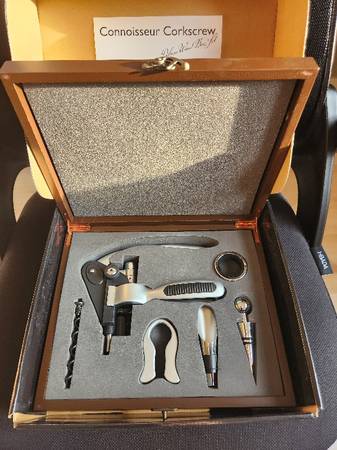 Brand new, unused Connoisseur Corkscrew Set in original packaging Deluxe Wood Box includes : Corkscrew Foil Cutter Wine Collar Wine Pour Wine Stopper Spare Worm Screw