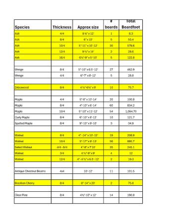All lumber in our shop is FAS or better, kiln-dried in our on-site kiln, and includes a wide variety of species. Every board is priced at 40% off wholesale, with pricing calculated per board foot.