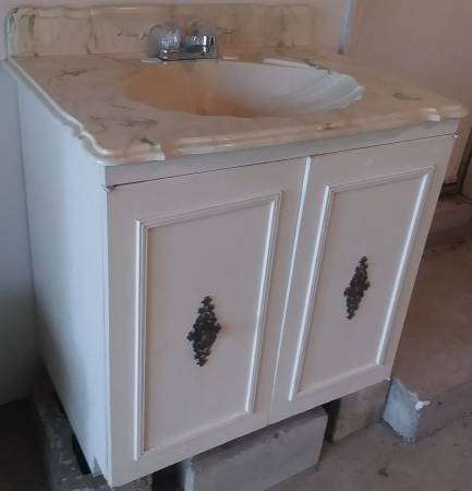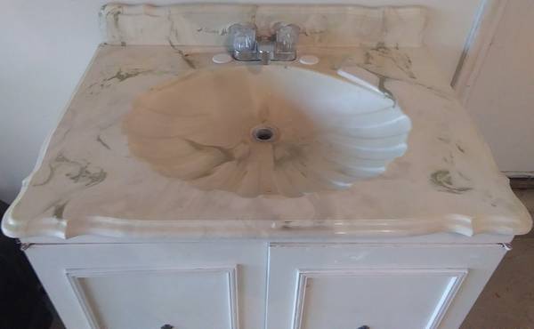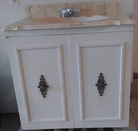 Antique (ca 1950s) Bath Vanity with Countertop & Faucet (Faucet is not antique). 30" wide x 22"deep x 31" tall. Countertop and 4" Backsplash are cultured marble. Vanity is solid wood. Excellent condition but missing a doorknob, and a tiny crack in bowl that is transparently sealed and does not leak.