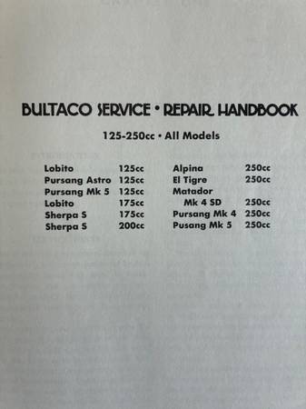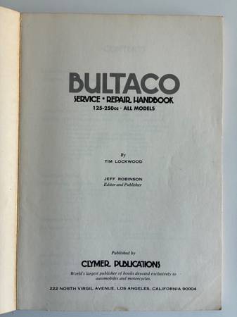 Clymer 1973 service manual for all models of Bultaco 125cc to 250 cc motorcycles. Excellent condition.