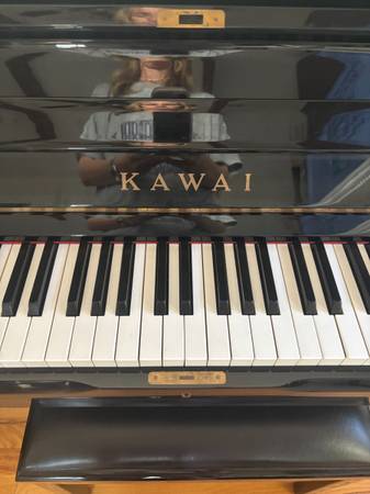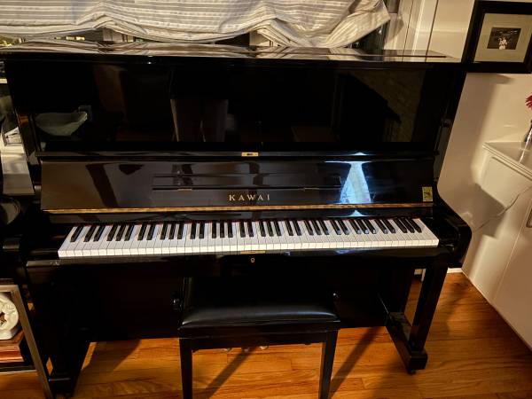 Kawai Piano. This beautifully crafted upright piano delivers exceptional quality. Perfect for both home and professional use. Sturdy build, responsive action, long-lasting tone stability. Full size, weighted keys. High polish. Good condition. One scratch on front of piano. Weight: Approx. 525 pounds.