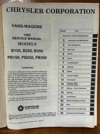 1982 Dodge Ram, Van, Truck, Wagon, Voyager, Owner's Manual and Dodge Service Manual for models B150, B250, B350, PB150, PB250, and PB350. Operating instructions and detailed full service...