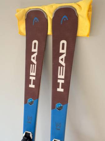 For sale: one pair of used Head V-Shape V4 men's skis 163cm with bindings. Used a few times by one owner. Minor scratches and dents on the topsheets. Mint condition. Cash only.