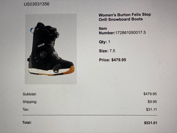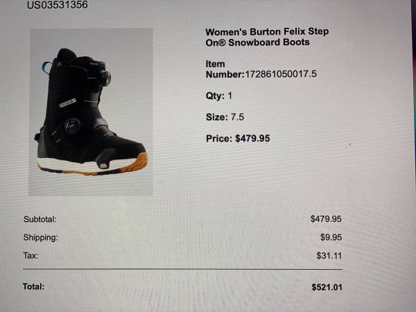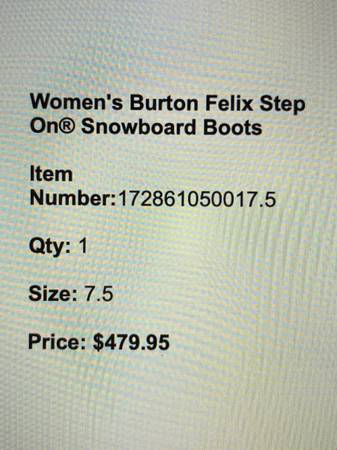 Women's Burton Felix Step On Snowboard Boots, Size 7.5 Purchased last year for our daughter but foot grew and can't return. Original price $480, Will sell for $300. Come try on before purchase. Used...