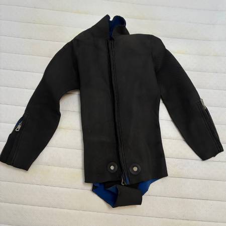 Older medium-small adult trim male black neoprene wet dive suit. Also have sleeveless wet suit, wet suit hood, gloves, and boots for sale.