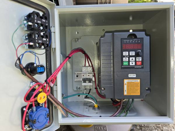 The 1 HP three-phase motor has been professionally adapted to ubiquitous 220-240V single phase using a variable frequency drive, allowing speed to be reduced on the fly as needed for more delicate work.