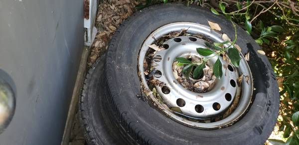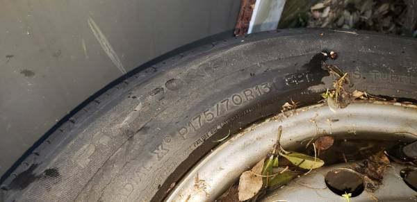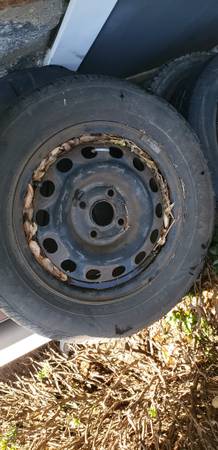 Four steel silver wheels with tires unknown condition and years from a Honda Civic. 13-in rims ,tire size in pictures. Also have one black 14-in steel rim with a tire on it possibly off an accord or a different Civic, also unknown condition. All tires have good tread. Sold as is, make offers on the one, the four or all five.