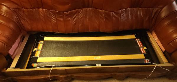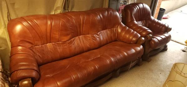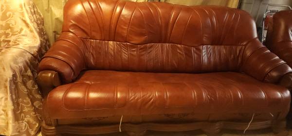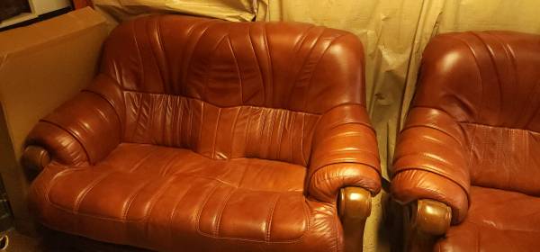 Four pieces living room sofa set hand crafted oak wood and leather. Includes sofa bed, love seat armchair and oak wood coffee table. please contact Tom.Price negotiable.