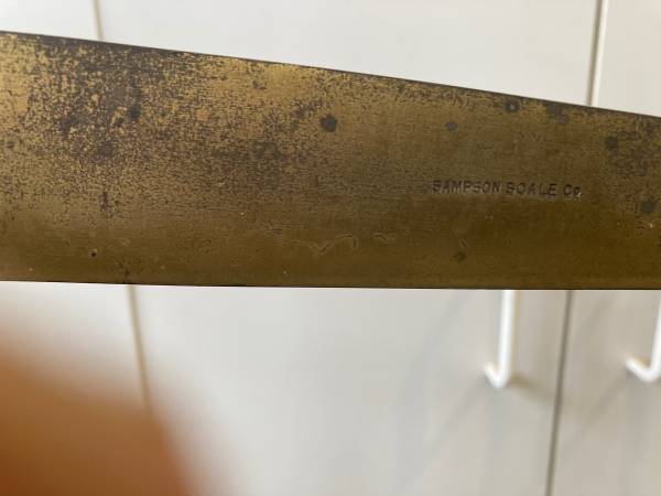 ANTIQUE BRASS BALANCE SCALE HUGE BALANCE SCALE MADE BY SAMPSON SCALE CO. IT IS 32” HIGH X 34” WIDE X 11” DEEP AND WEIGHS 15 LBS. IT HAS A WONDERFUL PATINA OF AGE AND THE PIVOT MOVES FREELY. LOCAL...
