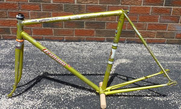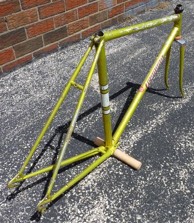 My friend Walt is cleaning out his collection and asked me to list some bikes for him, since I have connections with my business. This frameset has a 53cm seat tube c-t-t (51.5cm c-t-c) and 53cm top tube. The paint is a little rough, so it could stand some restoration, if that is your thing.