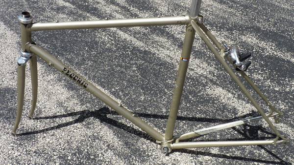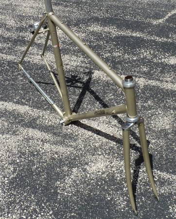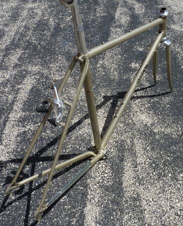 My friend Walt is cleaning out his collection and asked me to list some bikes for him, since I have connections with my business. This wonderful frame, built with Columbus tubing (remnants of the sticker remain), has a 52cm c-t-c seat tube and a 53 cm top tube. Included are a Campagnolo Super Record headset and a Chorus 102mm bottom bracket (seatpost and brake in photos not part of sale).
