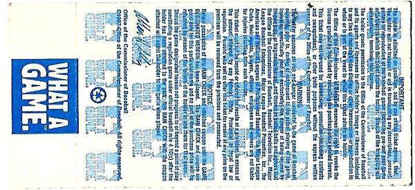 Original, pre-owned - post-season "playoff" Game #1 ticket stub ... pertaining to the start of the (1997) American League Division Series (ALDS) ... played between the NY Yankees vs. Cleveland Indians ... Game #1 was played @ Yankee Stadium, on (9-30-97) ... ticket stub is labeled & identified as - Home Game "A" ... NY won the game (8-6).
