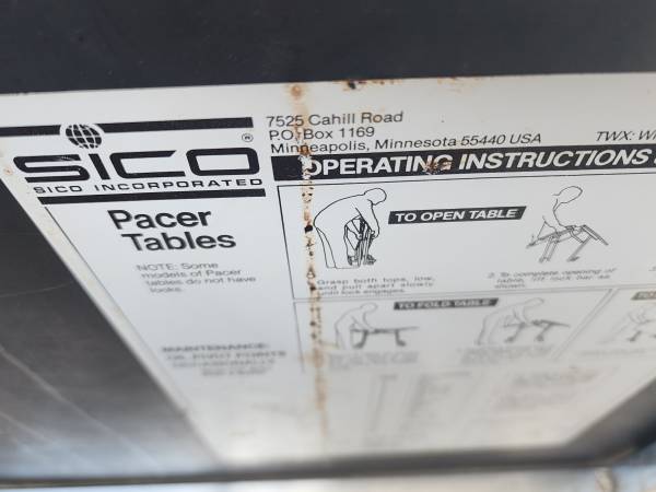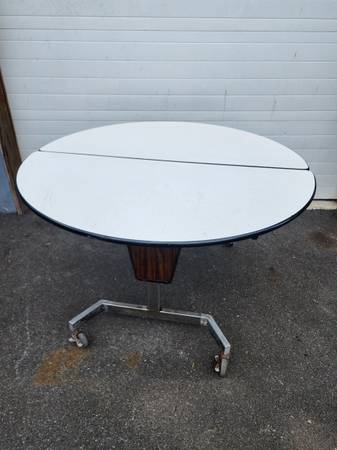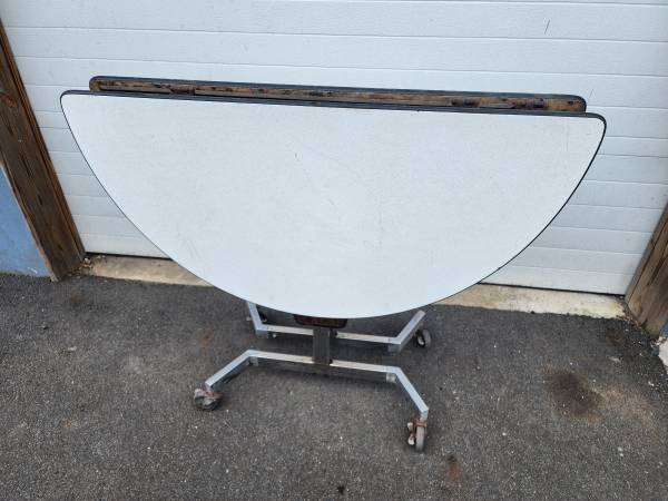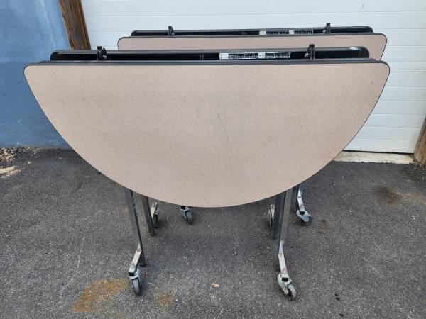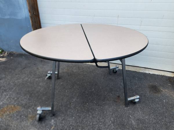 Sico 48" Round Mobile Cafeteria Banquet Pacer Folding Table, Laminated top and chrome metal frame. Several available $75 OBO each, all are in good/fair condition with light and heavy scratches and dusty, School system Surplus inventory.