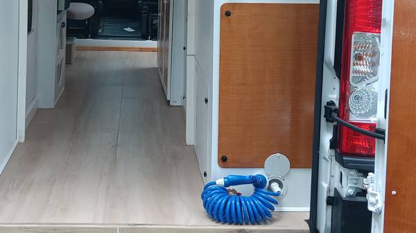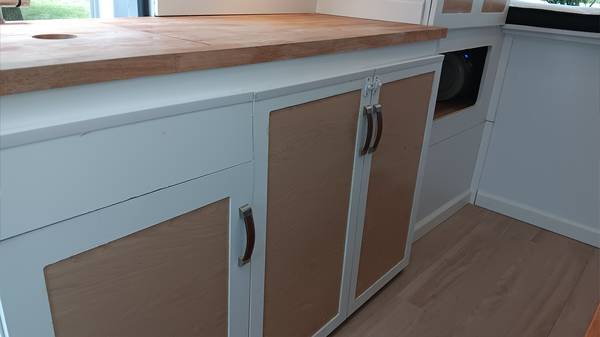 Multiple hours were spent on the detailing of vehicle including matching walls to flooring, installation of custom cabinetry, a skylight, custom door panels, rear rooftop fan, and running boards. Harper has hot and cold running water, 31 gallon water tank, deep drawn steel sink, hardwood countertop, 5 gallon gray water-tank, and a 10 liter hot water heater/tank. The van has a full size refrigerator& freezer for maximum food storage. On average, refrigerator only requires 80 Watts of power With 800 watts of solar it can run 24 hours a day year round. A second shower at the rear of Harper provides a heated outdoor shower