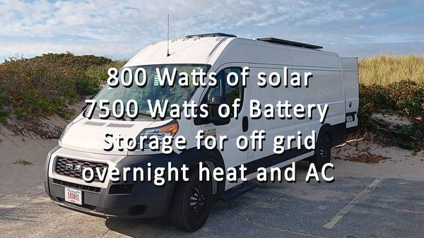 This van was designed for adventure and daily practical use; a home on wheels. Walls, floor, and ceiling are all insulated and the van has a dedicated heat pump. The 800 Watts of solar panels constantly charge the battery generator during daylight hours On the road you'll be reliant on solar power and recharging from the van's alternator. You'll be able to take long-distance trips and be totally self reliant. But as soon as you plug into 120 Volt shore power you can run power the entire van. If you have access to a shore connection you can live in the van in the summer in Florida, or New England in the fall or winter. If you want an off grid heated van you can install a Webasto gasoline heater for about $2,000.